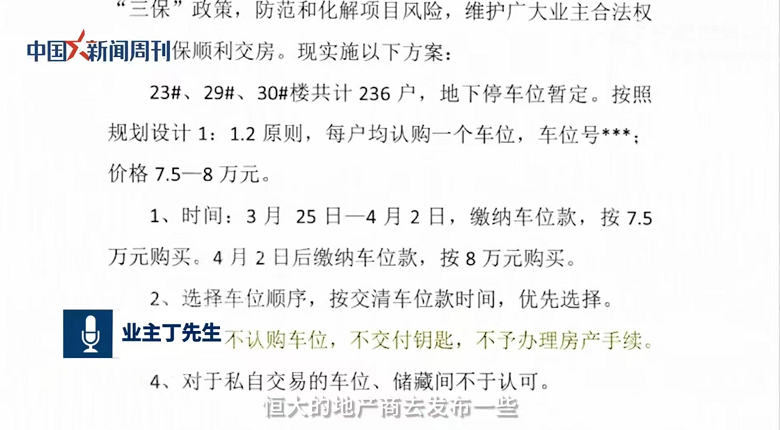 对于强制买车位的原因,有不愿具名的知情人士向中国新闻周刊表示,该项目仍有未建成楼栋,“目前监管资金已经为负,只能用车位抵。”