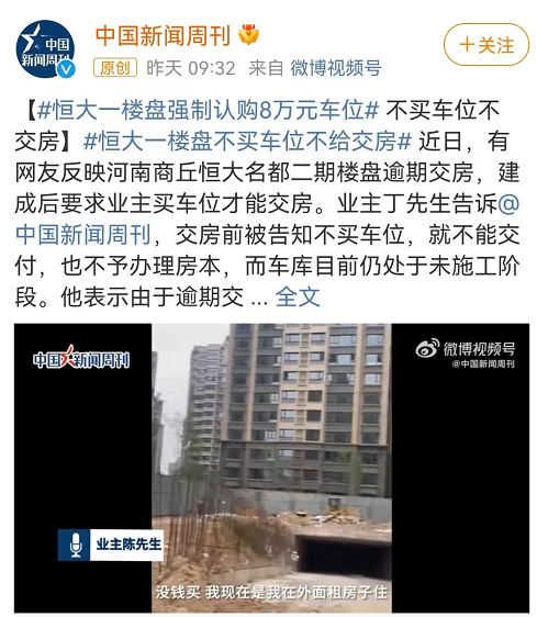 近日,有网友反映河南商丘恒大名都二期楼盘逾期交房,建成后要求业主买车位才能交房,车位价格达8万元。