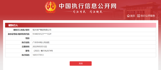 而此后在5月12日,据中国执行信息公开网显示,恒大地产集团有限公司又成为被执行人,新增标的16.93亿元。该案案号为(2022)粤01执2674号,由广东省广州市中级人民法院执行。