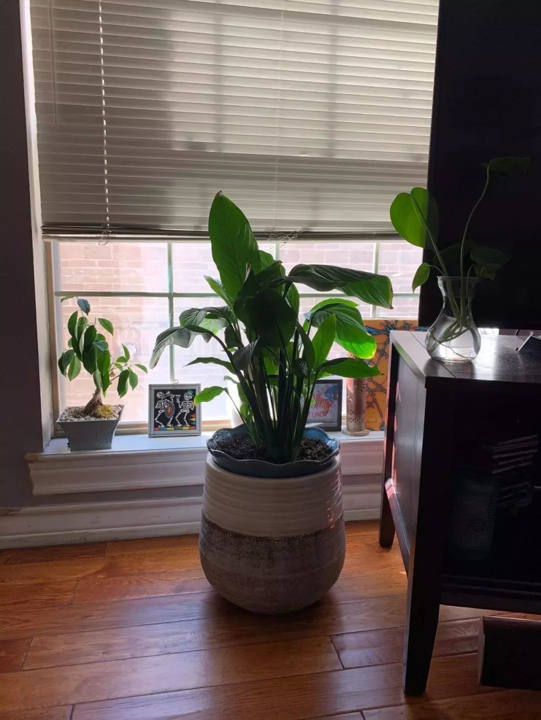 也可以摆放一些小巧的白掌盆栽,植株高度在10多厘米左右。白掌有适当散射光,就能孕育白色的纯洁花朵,它的叶子翠绿很好养活,保持光线明亮。