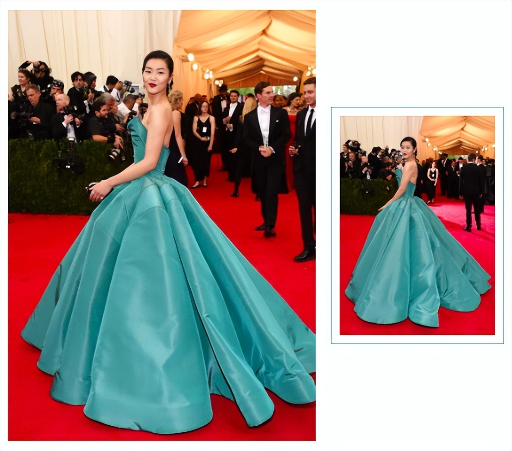 芭比的造型灵感来自于表姐2014年出席Met Gala慈善晚宴经典的Zac Posen绿裙。