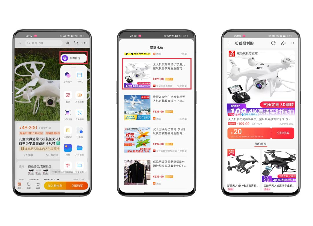 如果你是O系品牌的用户,就可以通过手机自带的「三方比价」功能进行比价了了,这里我用OPPO Find X5 Pro告诉大家操作方法。只需在淘宝、京东等电商平台打开智能侧边栏,并点击上面的同款比价就能进行不同平台的价格对比了,这对于一些比较喜欢薅羊毛的小伙伴来说用处非常大。