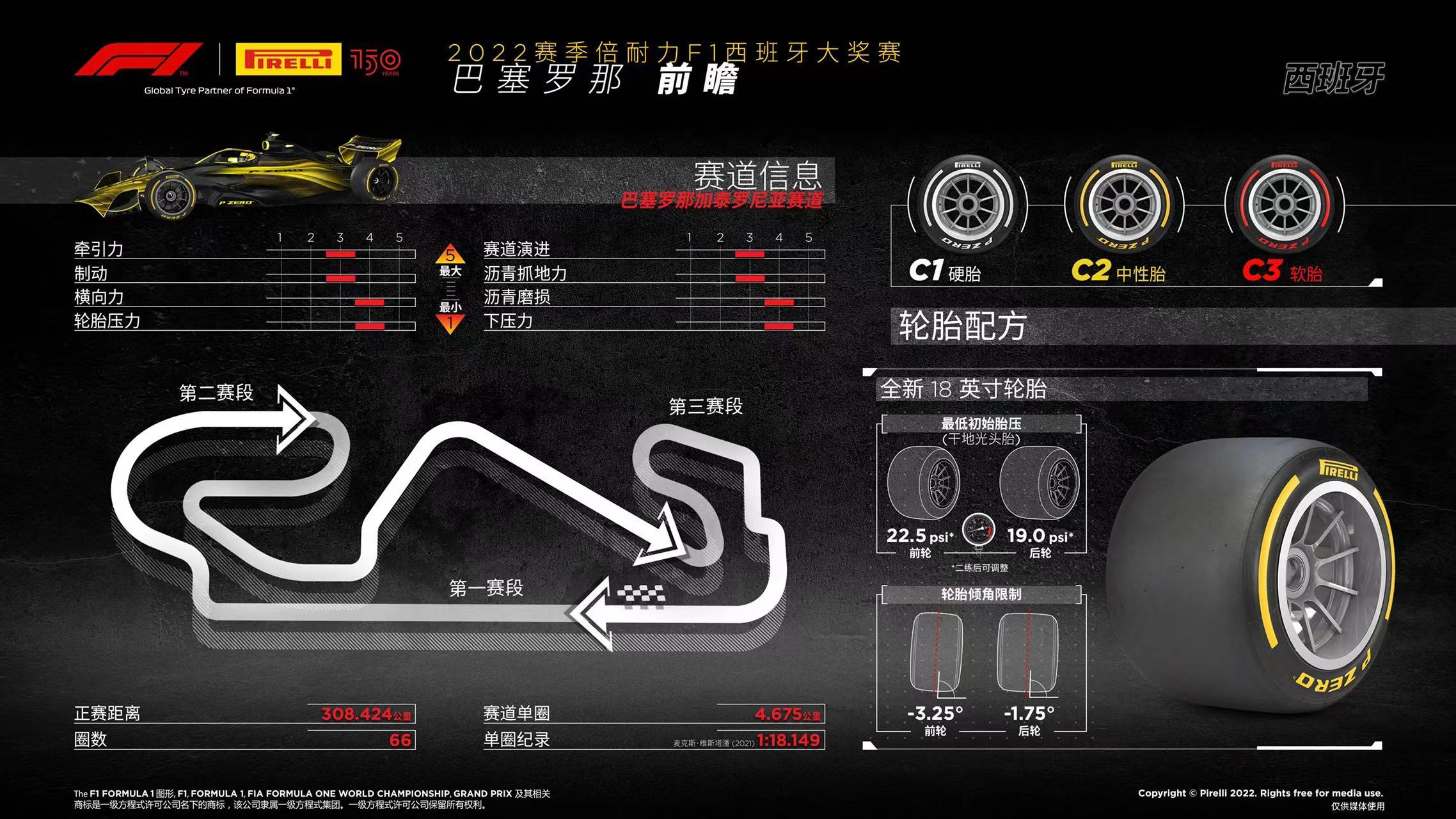 ● 作为西班牙大奖赛的冠名赞助商,倍耐力为本站比赛带来了2022赛季轮胎系列中最硬配方的轮胎组合:C1为PZero白色硬胎,C2是P Zero黄色中性胎,而C3则是PZero红色软胎。这是一个相当简明的决定,采用了和去年同站一样的配方组合,不过今年引入了全新的轮胎系列,从测试和先前的比赛来看,巴塞罗那赛道对轮胎的要求非常高。这其中包括3号弯和9号弯两个长弯:所有的弯角都会对轮胎施加巨大压力。