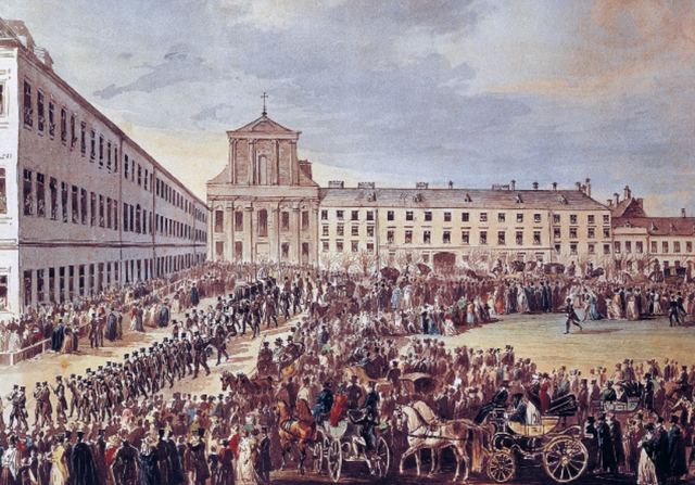 下面这张图描绘了贝多芬的葬礼,可以看到数以千计的人在维也纳的街头排起了队。抬棺人都是著名音乐家,其中包括弗朗兹·舒伯特和卡尔·车尔尼。