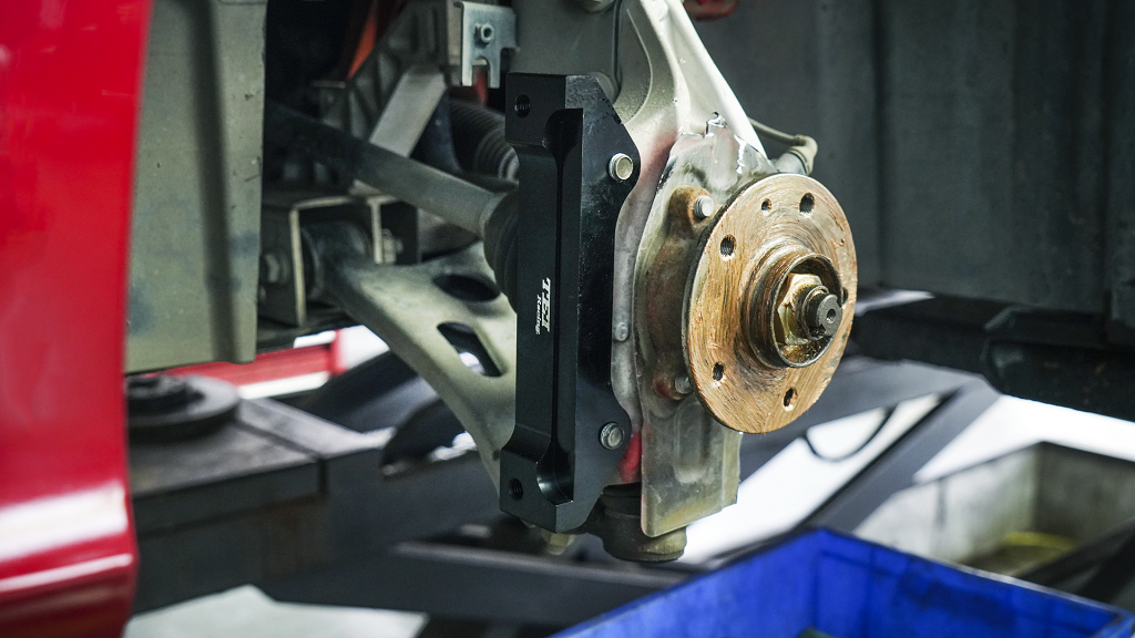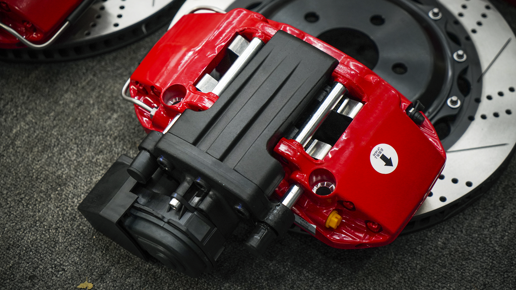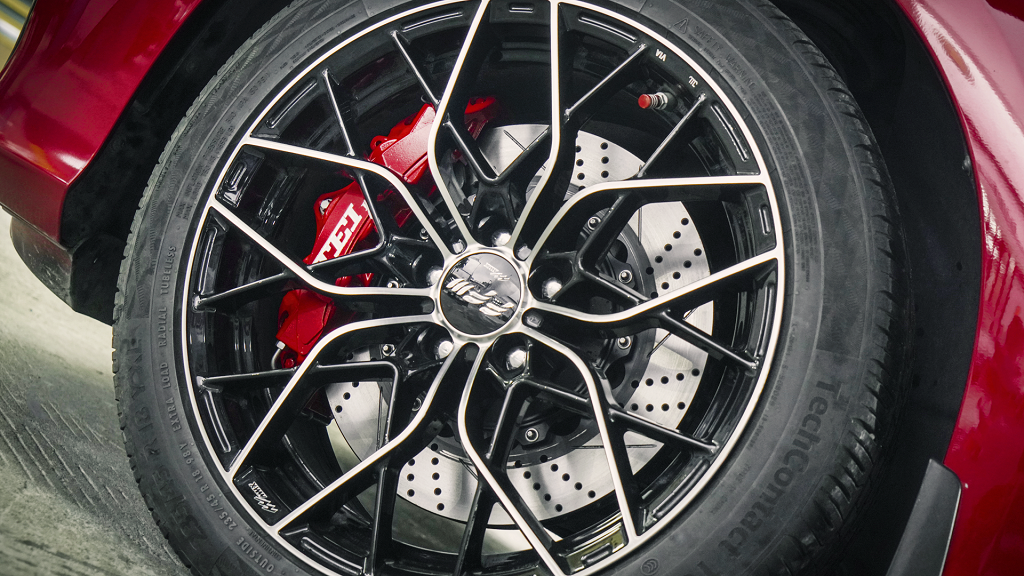 前轮TEI P60NS卡钳采用两片式铸造六活塞设计搭配355打孔划线碟盘。改善刹车盘表面周围的气流,提高散热效率;标配防尘套,降低维护成本,造型饱满精致,适合中大型轿车、跑车、SUV和MPV等车型选用。