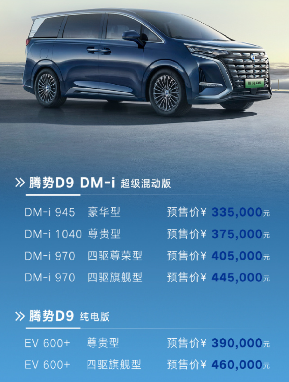 IT之家 5 月 16 日消息,今天,腾势公布了 MPV 车型 D9 的预售价格,DM-i 超级混动版售价 33.5 万元到 44.5 万元;纯电版售价 39 万元到 46 万元。