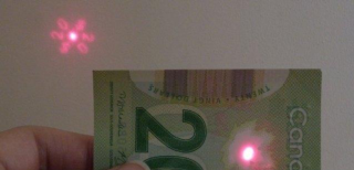 加币的质感与澳元类似,摸上去像是塑料,而不是“纸钞”。但防伪效果极好。 如果你用激光照射加币上的枫叶,钞票的面额就会神奇地出现在光透过的墙面上。