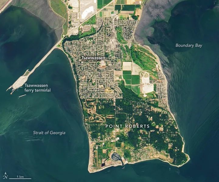 只是, 这种划分方法导致加拿大BC省大温地区南部一个向南伸过北纬49度线的半岛“罗伯茨角”(Point Roberts)被直接“裁”给了美国。