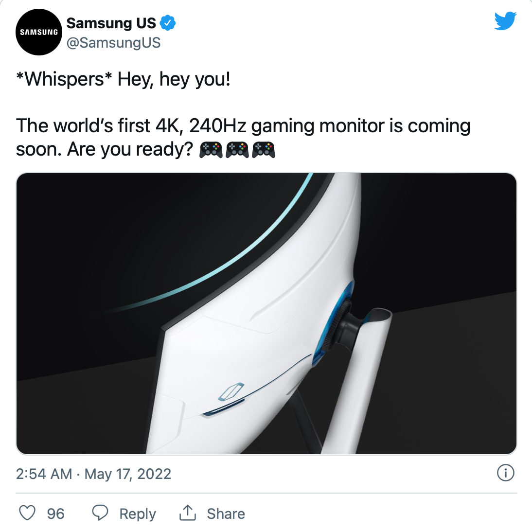 IT之家 5 月 17 日消息,今天,三星官方发布预告,称世界首款 4K 240Hz 显示器即将到来。