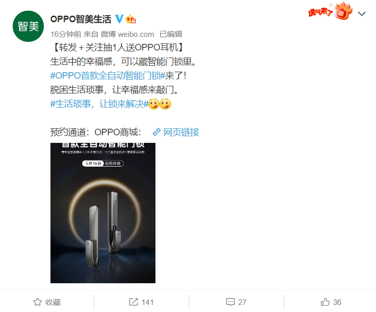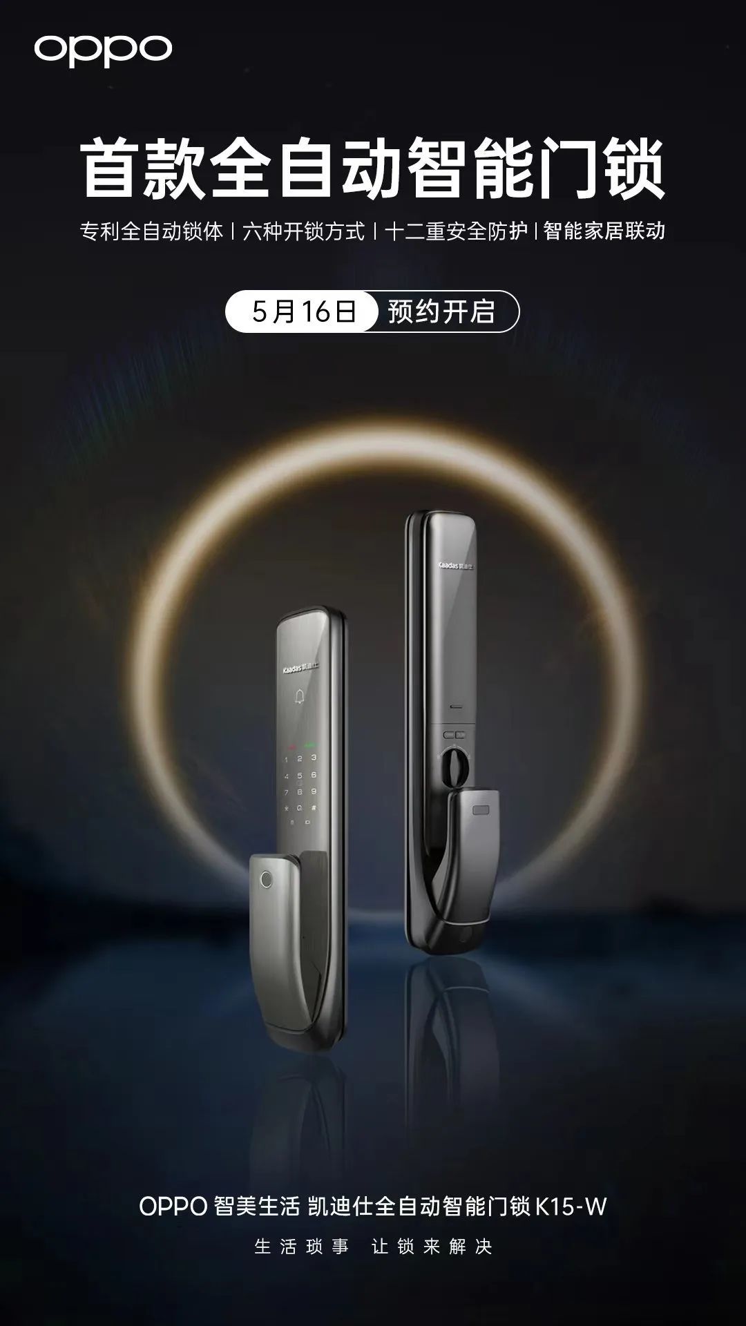 5月16日,门锁世界从@OPPO智美生活官方微博获悉,OPPO联合智能锁领军品牌推出了OPPO智能生态首款全自动智能门锁产品——凯迪仕全自动智能门锁K15-W,并已于16日10时30分开启预约,零售价为1999元。