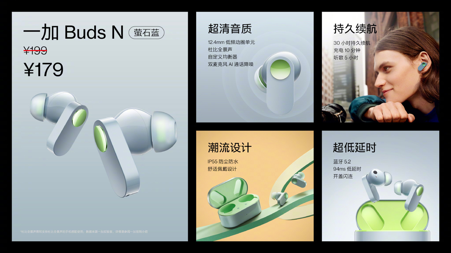 一加 Ace 竞速版发布会上,官方为一加 Buds N 无线蓝牙耳机推出了一款新配色,名为“萤石蓝”。