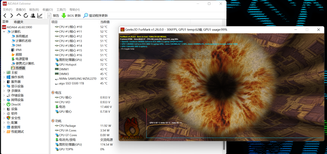 然后我们使用 FurMark 甜甜圈进行单烤 GPU,由于 DynamicBoost 技术的加持,这颗 RTX 3080Ti 全程都可以稳定在 175W 的满功耗,温度也仅有 62℃。可见 ROG 枪神 6 的散热功力相当之扎实。