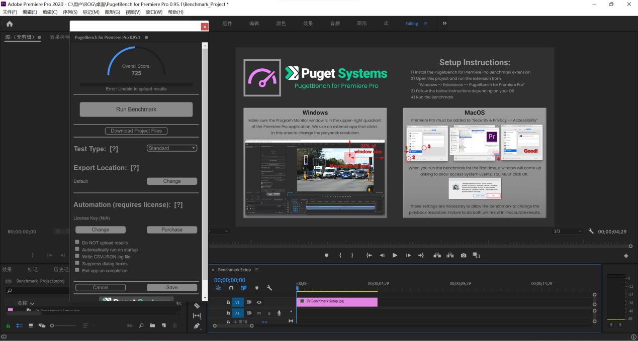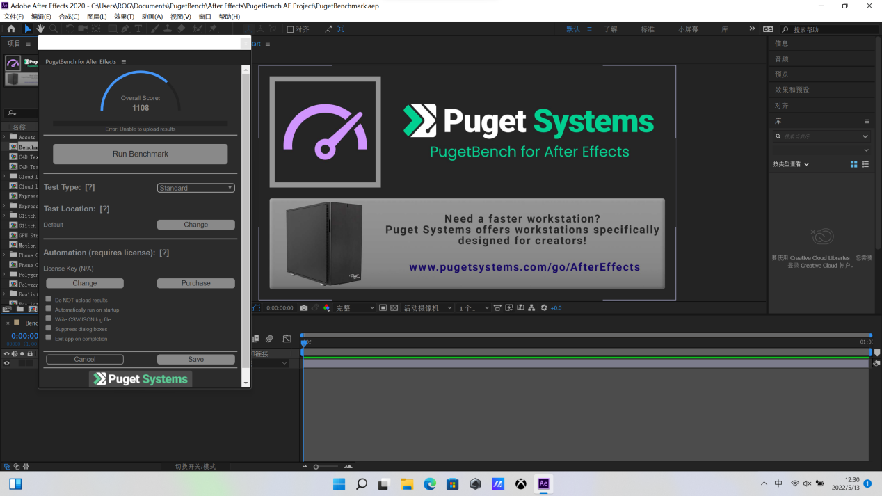 另外一款压力比较大的特效软件 Adobe Effects 中,我们同样使用 PugetBenchmark 进行测试。最终得分为 1108 分,生产力非常出色。