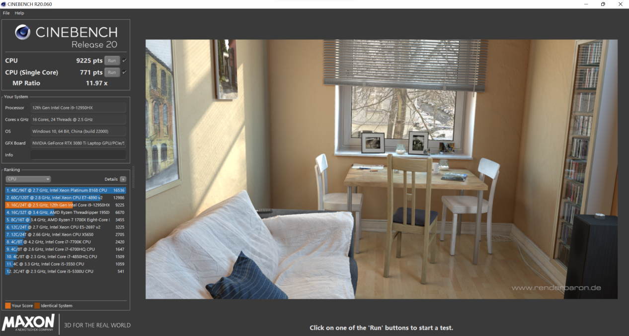 在代表 CPU 理论性能的 CineBench R20 中,获得了单线程 771 分,多线程 9225 分的成绩,这个成绩大概是什么水平呢?单核基本与 i9-12900K 相等,多核则介于 i7-12700K 和 i9-12900K 之间。不要说在移动端毫无对手,在桌面端也是真正意义上的第一梯队。