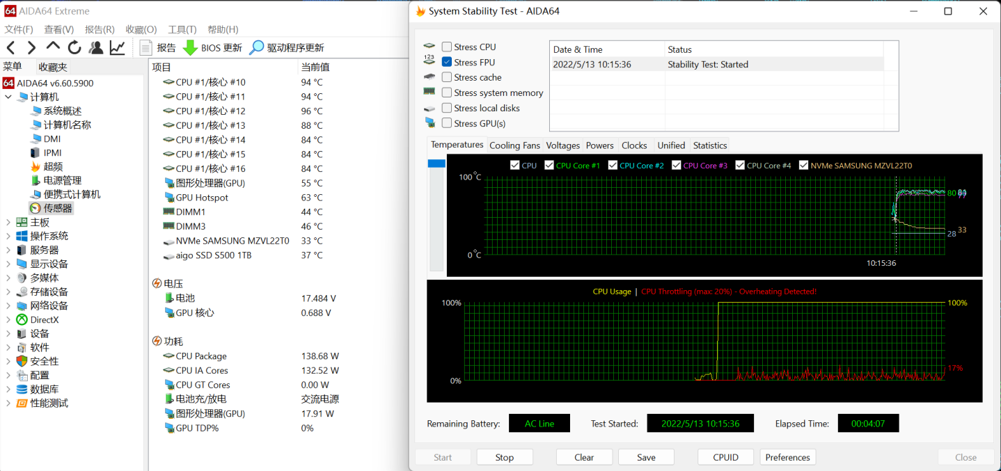 我们现在就进入烤机环节测试一下。首先是单烤 CPU,我们用 AIDA64 单烤 FPU 进行烤机。在 15Min 的单烤 FPU 后,CPU 可以保持在惊人的 140W,温度在 94℃左右,这个性能释放即便是塞一个桌面级 i9 也能压得住了,不可谓不强大。