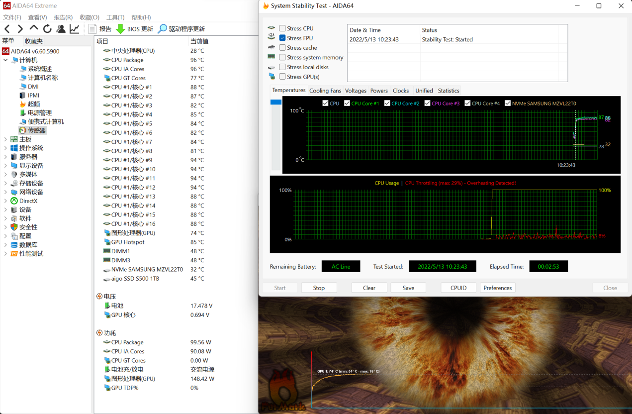 接下来我们同时烤 CPU 和 GPU,模拟最大的压力,运行 15 分钟的双烤。15 分钟后 CPU 稳定在 100W、96℃,GPU 稳定在 150W、74℃,总共加起来 250W 的性能释放,在整个笔记本市场中都难寻对手,也正是在这样扎实的基础下,我们才能在接下来的跑分环节中看到它真正的实力。