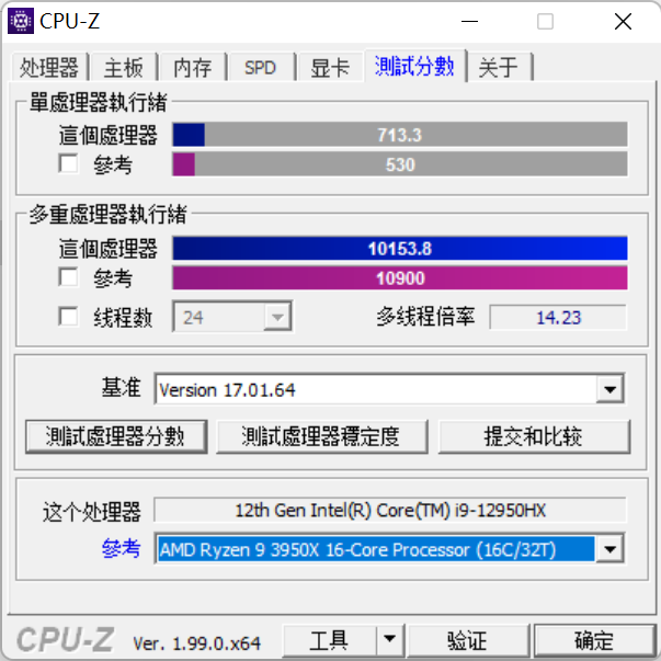 在 CPU-Z 中 i9-12950HX 成绩直接爆表,突破了 1 万分,来到了 10153 分,单核也达到了 713 分,性能怪兽,恐怖如斯。