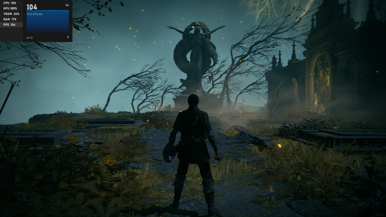 接下来我们来测试一下时下火热的《埃尔登法环》,在 2K 分辨率的最高画质下,可以跑到 105 帧左右,体验非常好。