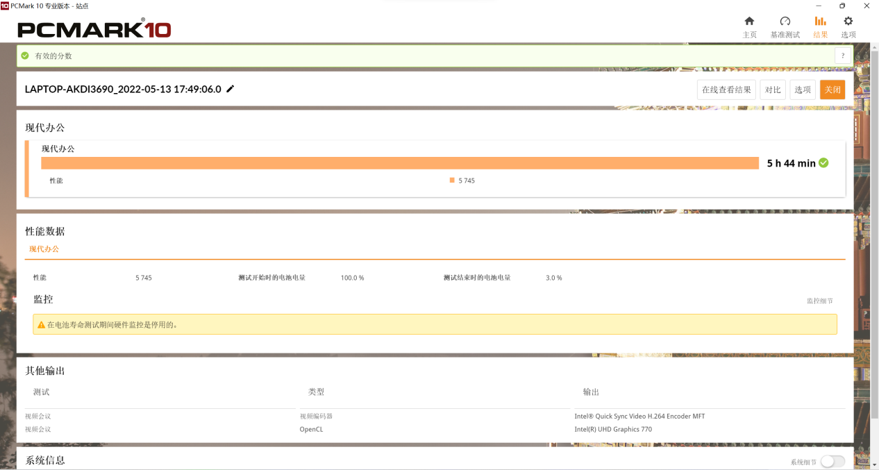 当然,续航也在很大程度上影响着生产力,我们切换双显三模,开启“核显直连”的省电模式运行 PCMark 10 现代办公续航测试,最终连续运行了大约 5 小时 44 分钟,配合 100W 充电器,可以满足短途外出办公的需求。
