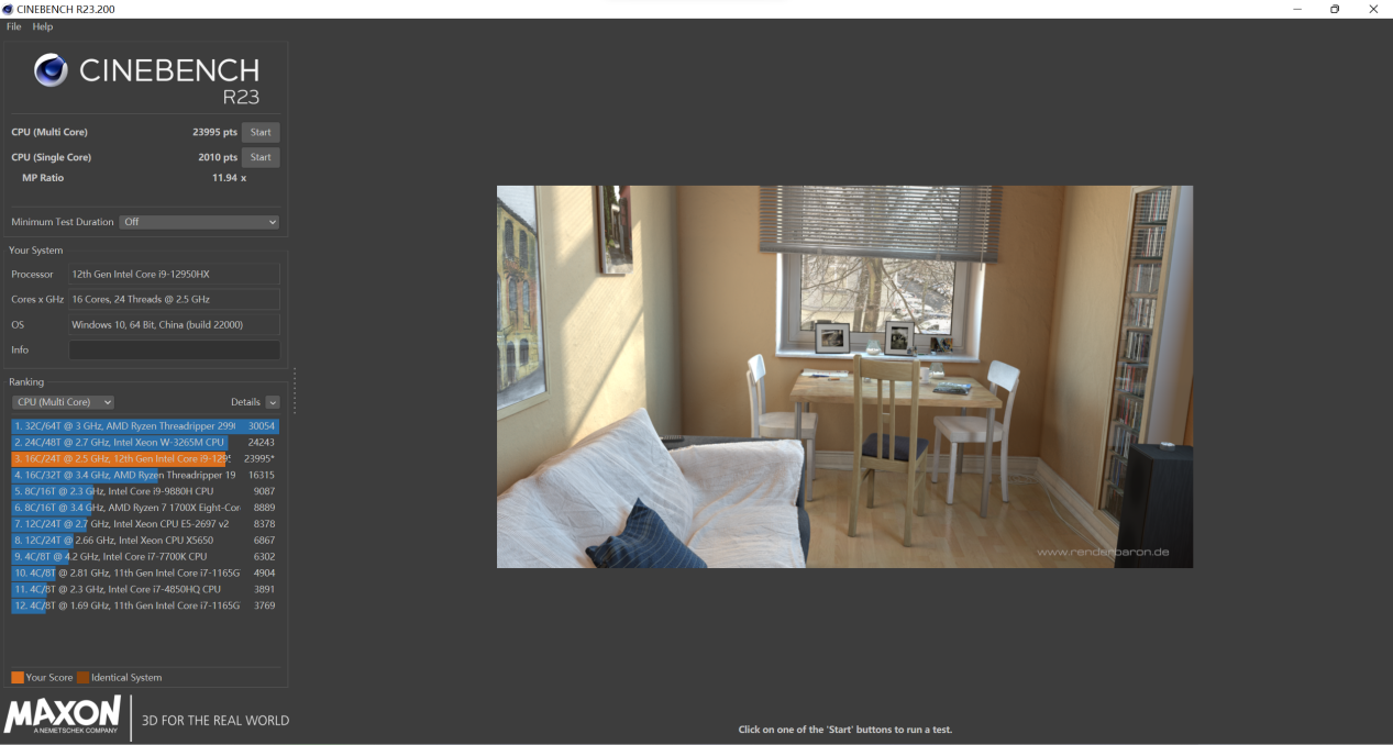 在 R23 中,获得了单线程 2010 分,多线程 23995 分的成绩,单核更是反超了 i9-12900K,仅次于 i9-12900KS,多核也基本与 18 核 36 线程的 i9-10980XE 和 20 核的 M1 Ultra 齐平了。