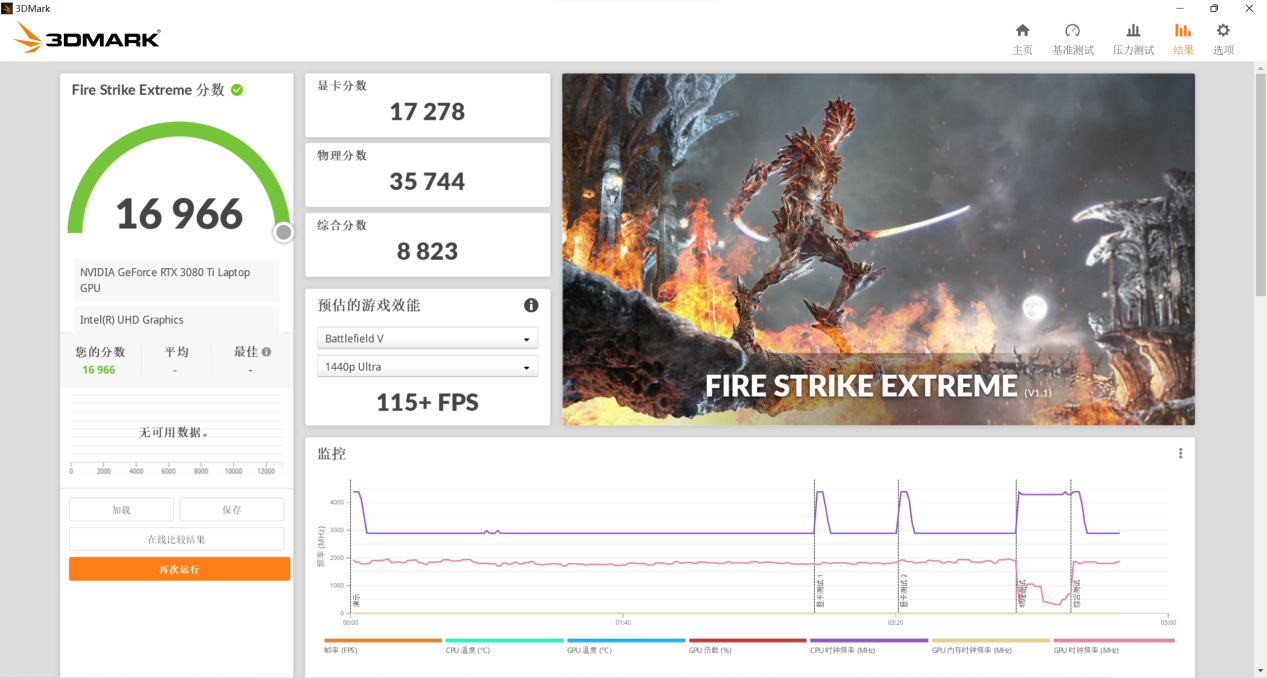 接下来看看显卡的表现,在 3DMark Time Spy 中的 GPU 跑分达到了 14279 分,在 3DMark Firestrike Extreme 中的 GPU 跑分达到了 17278 分,这个成绩相比 RTX 3080 提升了 10% 左右,是当今移动端的性能之王。