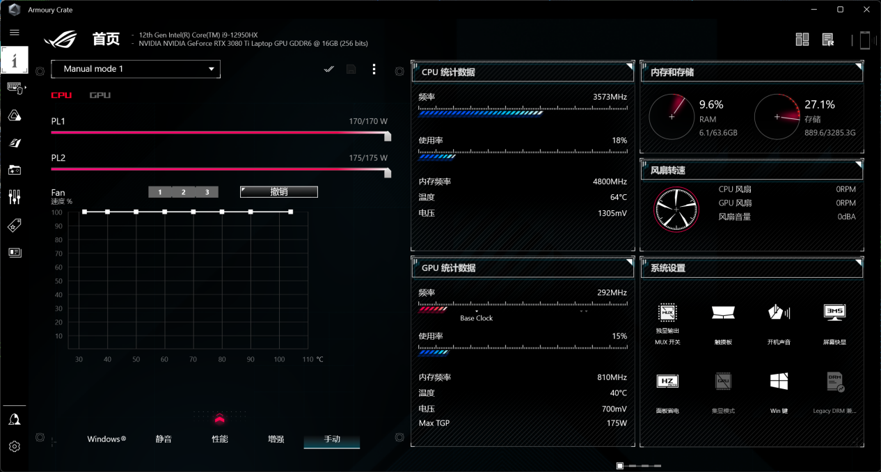 在烤机前,我们先在奥创中心内开启手动模式,并将 CPU 的功耗和风扇速度全部拉满,看看这套模具的极限在哪里。