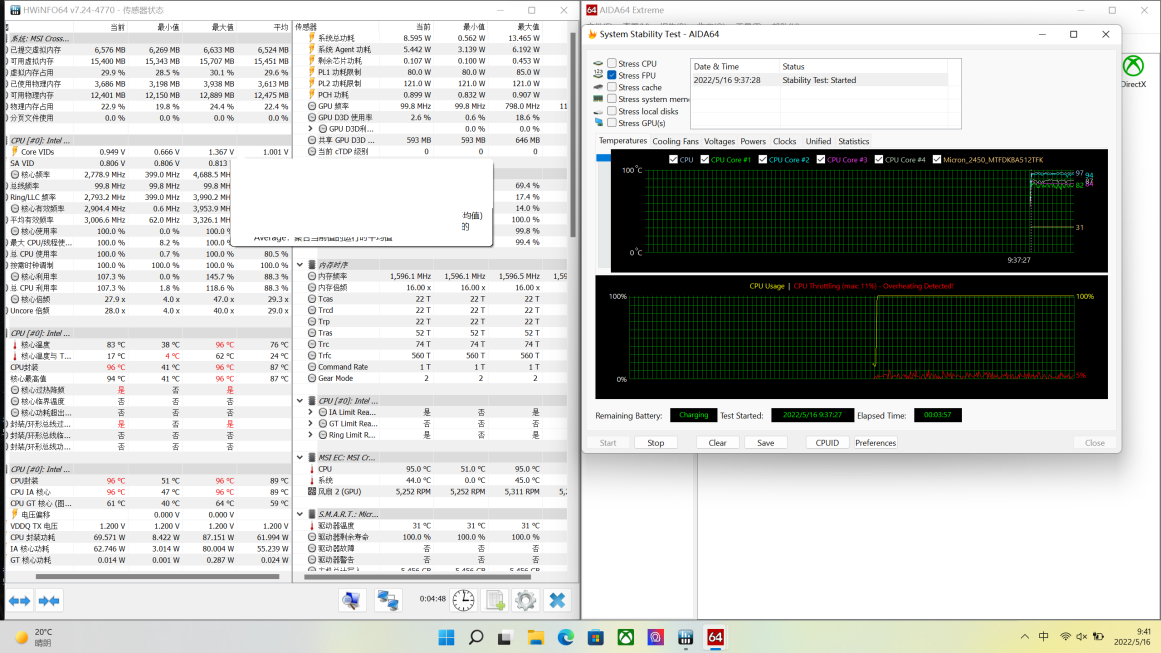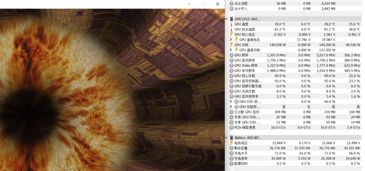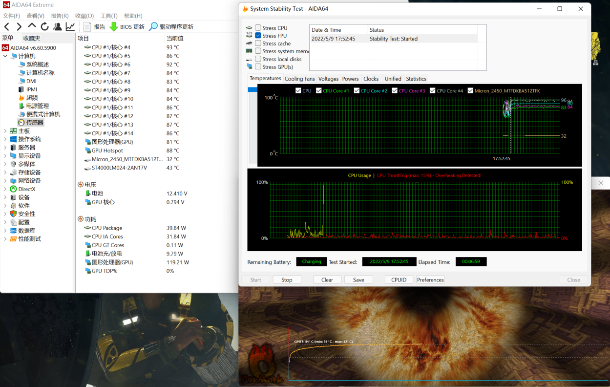 接下来我们同时运行以上两款软件,模拟最大的压力,运行 15 分钟的双烤。15 分钟后 CPU 稳定在 40W、93℃,GPU 稳定在 120W、81℃,这个整机 160W 的性能释放,对于 i7+3060 的笔记本还是相当不错的。