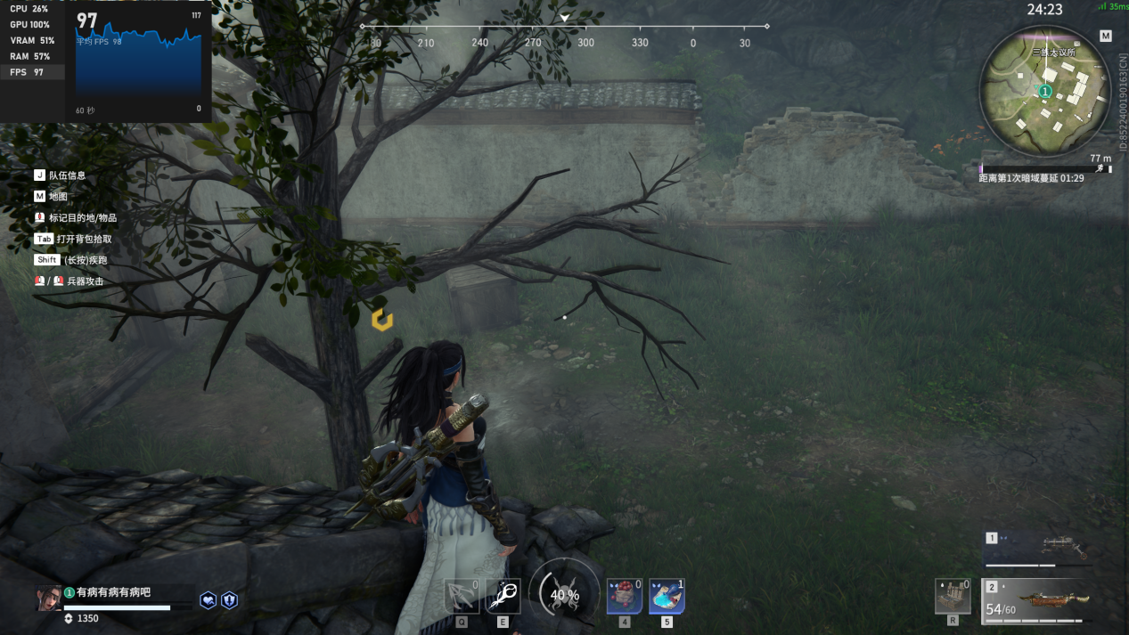 在国产武侠吃鸡游戏《永劫无间》中,我们开到高画质 + 平衡档 DLSS,可以达到平均 98 帧左右,哪怕对战时也依旧保持流畅。