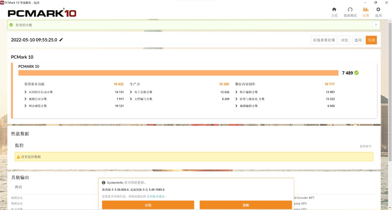 对于狂热的 Gamer 们来说,出色的性能也可以用来剪辑一些游戏视频,或者进行游戏直播,比如用 Cuda 核心为视频剪辑和模型渲染来加速。我们接下来测试一下生产力软件。首先是代表综合办公性能的 PCMark10。得分为 7489 分,可以应对大多数所有的日常办公需求。