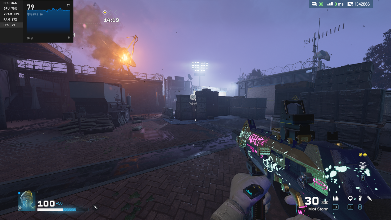 首先,我们先来测测本次联动的游戏《彩虹六号: 异种》,我们开启最高特效后,游戏的画面表现力还是很不错的,实测运行 BenchMark 可以达到平均 86 帧,畅玩不成问题。