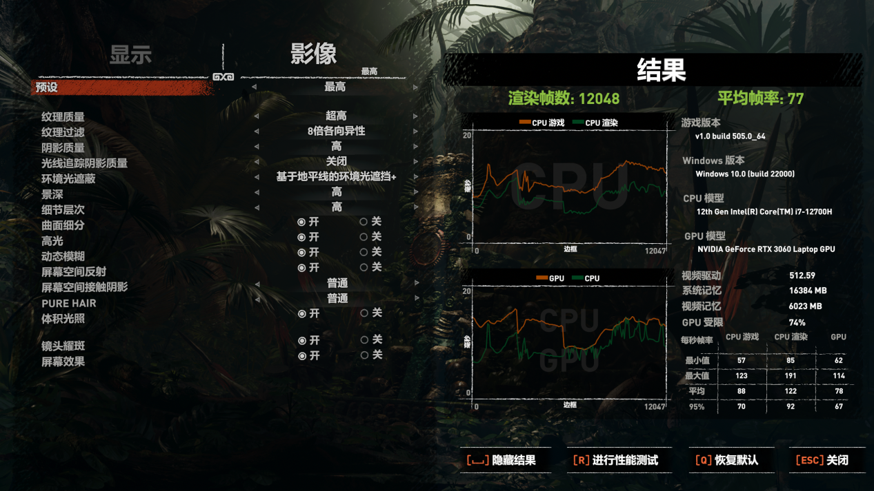 接下来我们测试一些 3A 大作,首先是跑分常客《古墓丽影: 暗影》,开启 2.5K 最高画质后,它可以实现平均 77 帧,畅玩 3A 完全没问题。