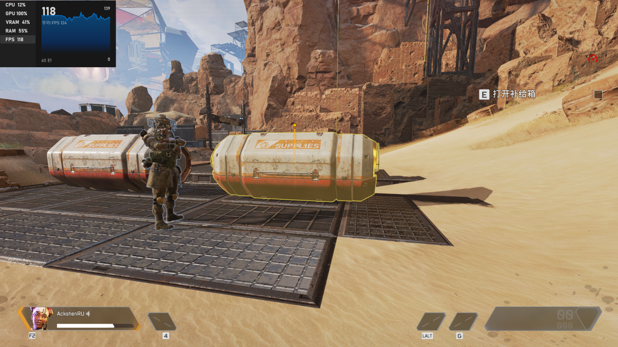 《APEX Legend》这款游戏的配置要求要高不少了,在训练场中,最高画质下它大概能保持在 118 帧左右,实际游戏体验当然也是非常不错的。
