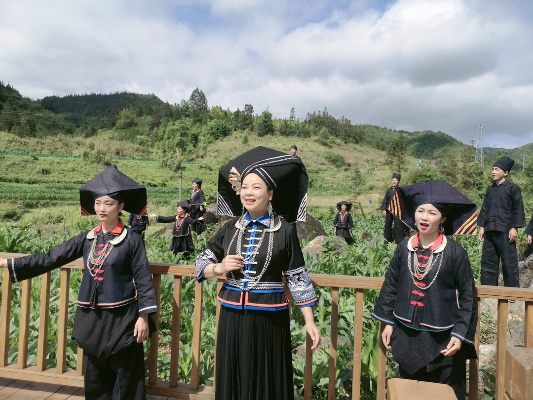 国家级非物质文化遗产项目那坡民歌的自治区级传承人和壮族女高音歌唱家黄春艳(左二)是土生土长的黑衣壮姑娘