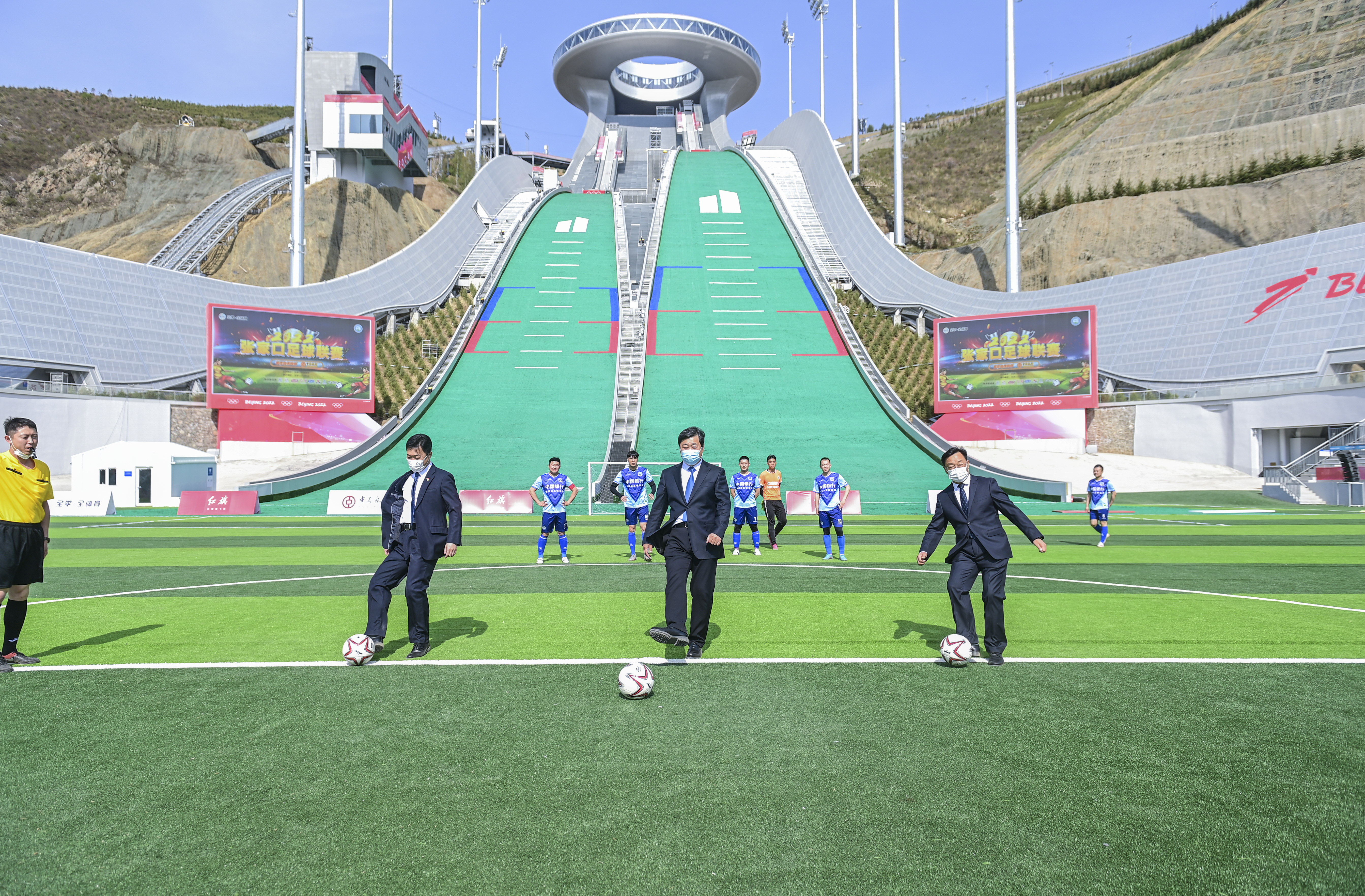 雪如意顶峰见证着张家口后冬奥经济建设的合作与发展,在跳台滑道的结束区,同时进行的是张家口市2022足球联赛。作为这座城市的精品赛事之一,张家口足球联赛已经连续举办了五年。平均每年比赛千场,赛程贯穿四季,形成了每周有球赛、全年不间断、球员转会制不断完善的办赛规模。到了冬季,举办别开生面的雪地足球。能够在国际顶级的场馆踢一场球赛,现场的参赛球员们都感到十分激动。
