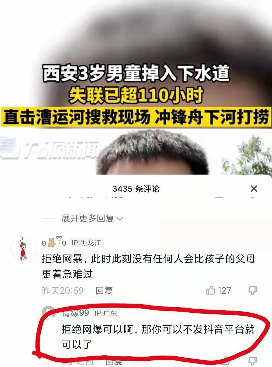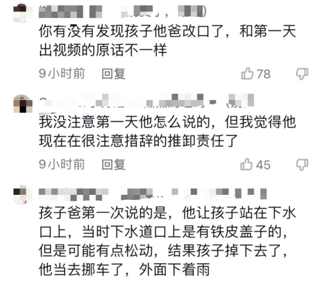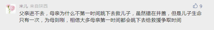 “父亲进不去,母亲为什么不第一时间跳下去救儿子,虽然错在井盖,但是儿子生命只有一次,为母则刚,相信大多母亲第一时间都会跳下去给救援争取时间。”