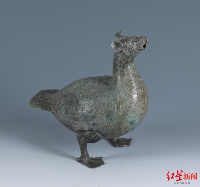 鸟形尊造型、纹饰及装饰极其精美。青铜器中的尊本是酒器,这件尊通体上下除鱼形嘴外,了无一孔,不具备容器的实用性,应系学习中原地区的鸟兽尊而作。其体轻、壁薄、中空,铸造难度极高。出土于巴人的贵族墓地,是研究巴人的审美情趣,工艺水平和铸造技术难得的艺术精品。