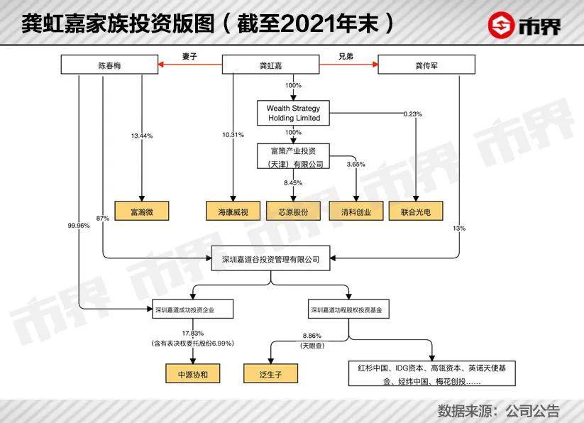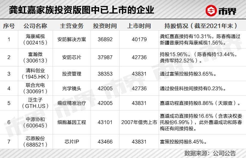 据记者不完全统计,龚虹嘉家族投资的企业中,目前已上市的就不少于 7 家。其中包括安防产业链企业富瀚微、海康威视、联合光电,生物科技企业中源协和、泛生子,芯片企业芯原股份及投资管理企业清科创业。