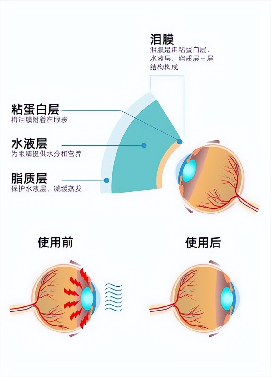 这是因为我们眼睛的泪膜不稳定造成的。泪膜由黏蛋白层、水液层、脂质层三层结构构成。其中,黏蛋白层讲泪膜附着在眼表,水液层为眼睛提供水分和营养,脂质层保护水液层,减缓蒸发。