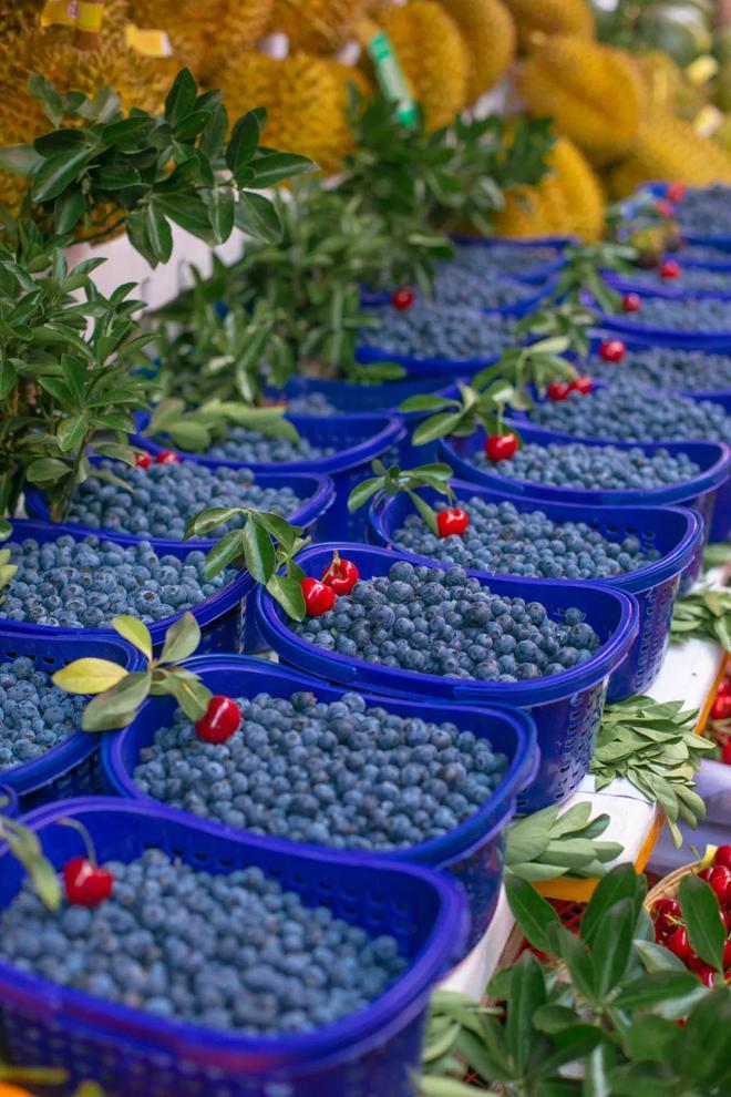 一筐筐的蓝莓整齐摆放在摊子里,点缀上两粒深红的樱桃,整个画面便鲜活了起来。