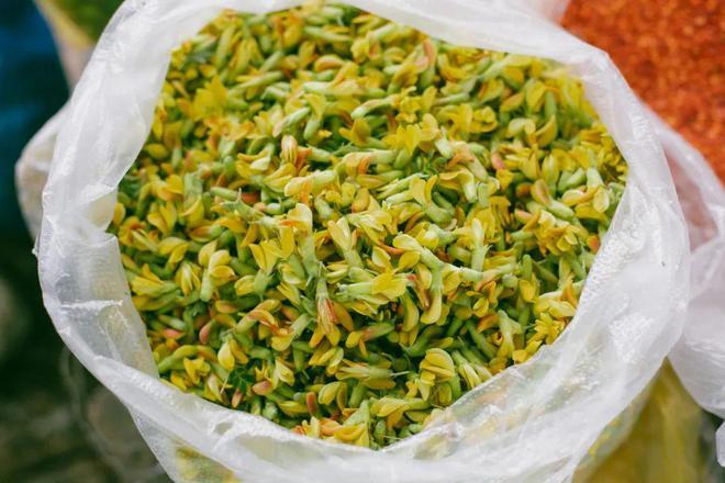 来自金江的摊主和先生告诉我们,黄色的是金雀花,用来蒸鸡蛋味道十分鲜美。