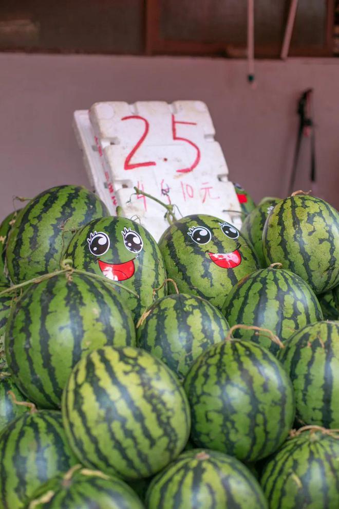 而这些外表平平无奇的西瓜,被童心未泯的摊主贴上了几张可爱的贴纸,顿时就变成了萌萌哒大家伙!