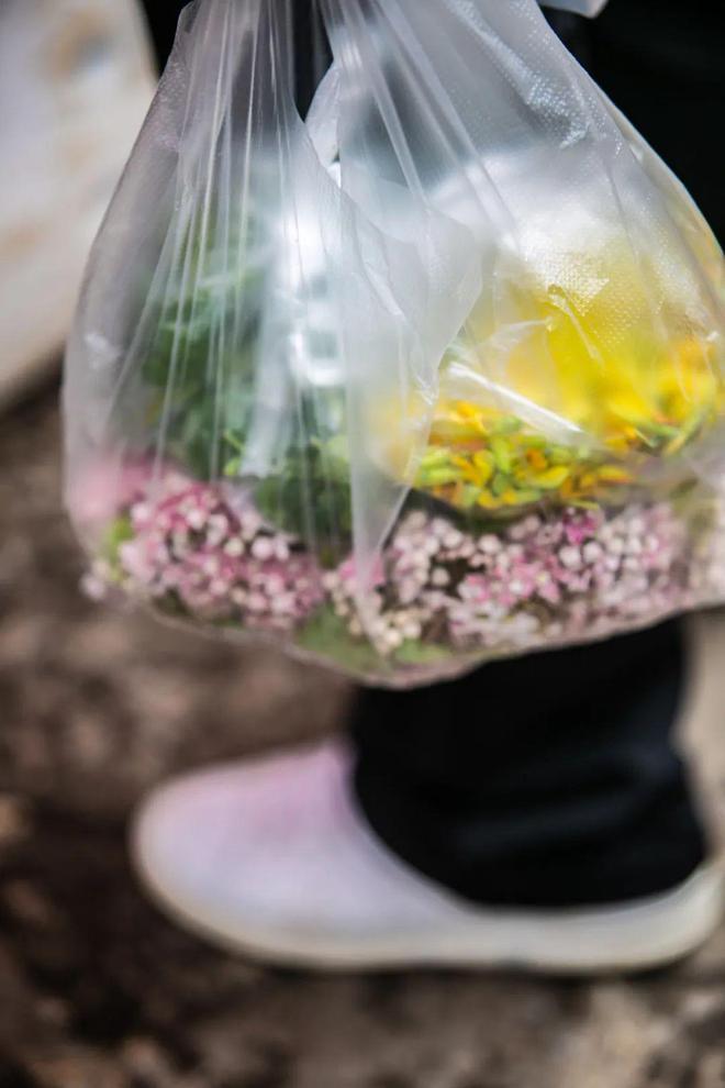在一众大同小异的蔬菜摊里,有一个独具特色的野菜摊吸引了我们的目光,摆放着各种颜色小花的摊摊前挤满了前来买菜的大叔大妈。