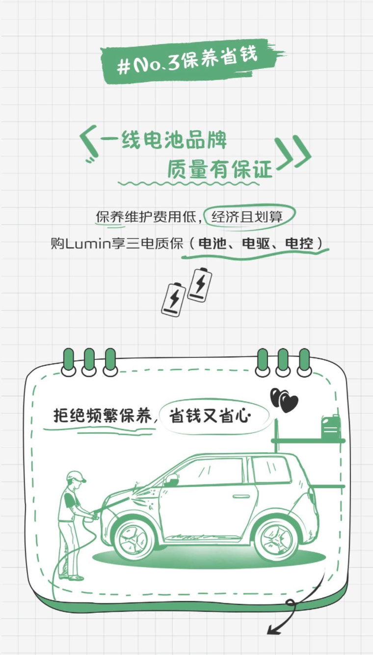 除了日常使用省钱之外,长安Lumin在保养方面的亲民性同样令人欣慰。据了解,该车型搭载的一线电池品牌,质量完全可以保证。而且购车还享三电(电池、电驱、电控)质保,解决了大部分用户购车困扰,买车用车后顾无忧。这也许正是这款国民出行精品车想要带给我们的舒心生活。