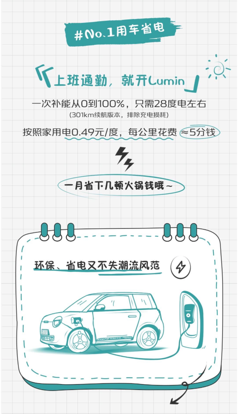 省钱,是年轻人对生活花费的合理规划,普适性较高的手账则颇受欢迎,长安Lumin省钱手账从多个维度清晰地展现了省钱er的方法。首先,长安Lumin是A00级纯电车,人们关注的就是耗电量及花费。而它一次补能从0到100%,只需要家用电28度,即按301km续航版本,每公里仅花费5分钱,轻松降低人们通勤开销。