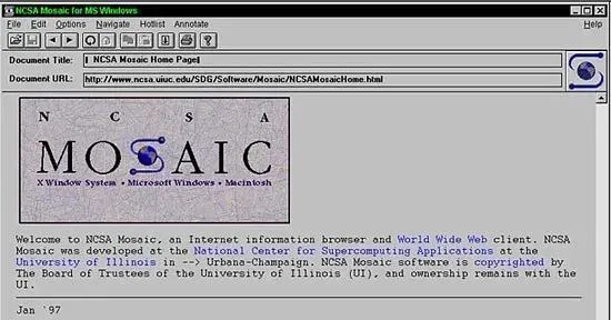 世界上第一款浏览器诞生于1990年,采用命令行形态。尽管当时电脑与互联网还远未普及,但要让更多人接触到互联网,图形界面是必要的。1993年,美国国家超级电脑应用中心(NCSA)的两位程序员马克·安德森、埃里克·比纳设计 Mosaic 浏览器,意为马赛克,这是最早的搭载图形界面的浏览器之一。