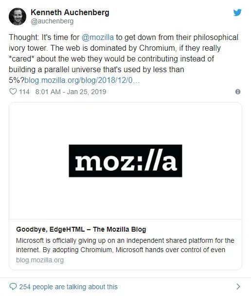 值得一提的是,微软转投 Chromium 之后,为 Code 团队工作的微软项目经理 Kenneth Auchenberg 甚至喊话称,Mozilla 是时候放弃自家 Firefox 的 Gecko 引擎了,Web 世界已经处于 Chromium 的统治。