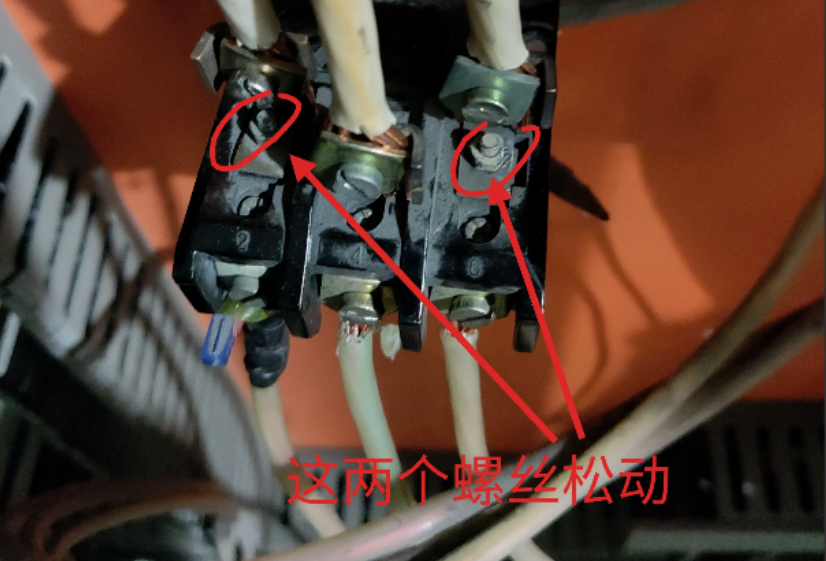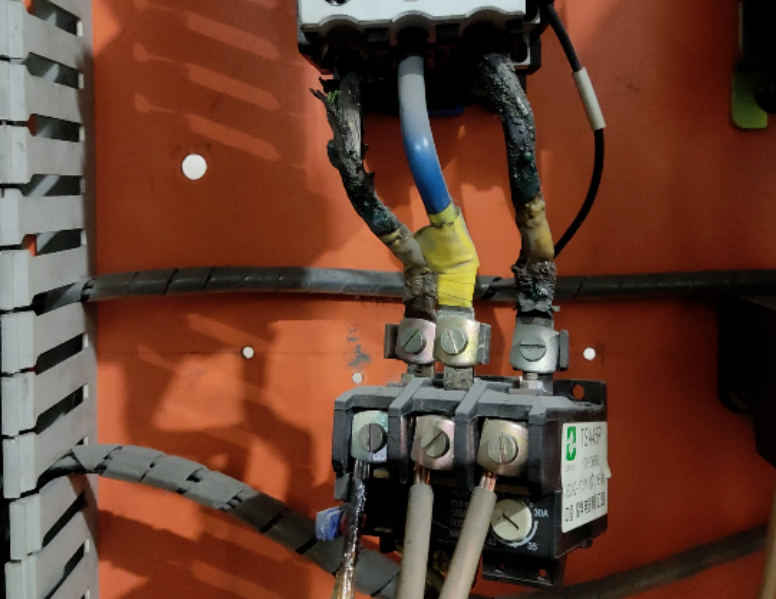 检查接触器出线端电缆压接螺丝,A相C相稍有松动,拆下烧焦的电缆,发现热继电器进线端子固定螺丝也出现了松动的情况。