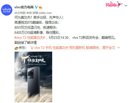 5月20日当天,vivo官方微博接连发布两张官宣海报,突出了vivo T2的特色亮点,并宣布了“即将出手”的消息,十分明确的预告:vivo T2即将到来。vivo的T系列,是去年10月份刚刚推出的一个全新系列,定位年轻时尚,以实用性出发、辅以超高性价比的定位,给人留下深刻印象,并得到了年轻消费者的欢迎。