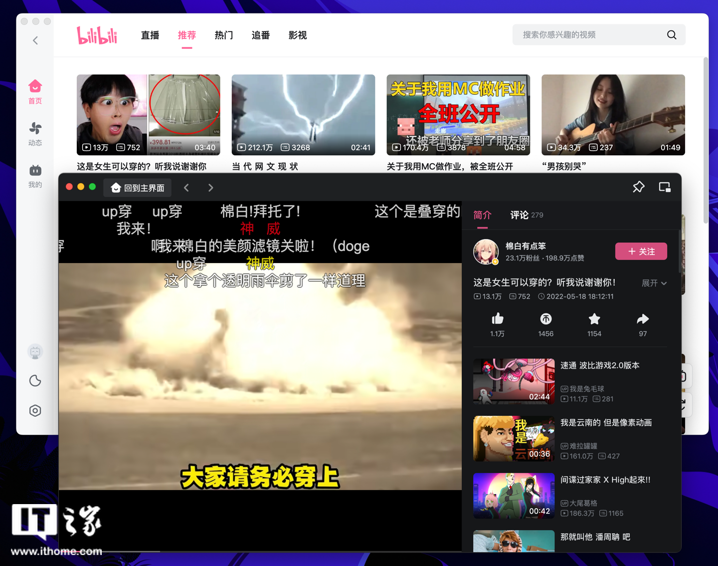 就整体设计布局来看,B站Mac 版客户端与之前发布的 Windows .exe 版本基本相同,左侧为首页、动态、我的,上方为直播、推荐、热门、追番和影视,视频播放是一个独立窗口。