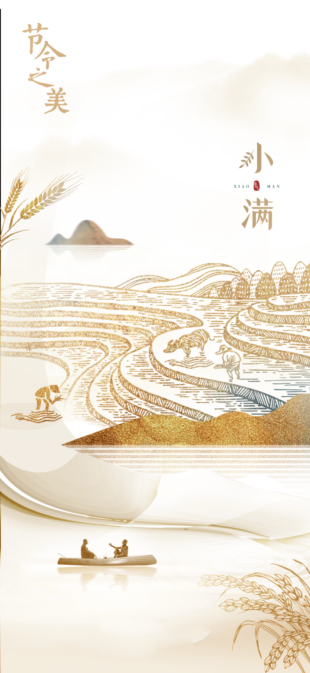 小满,二十四节气中第八个节气,夏季第二个节气。每年5月20日到22日之间太阳到达黄经60°时为小满。小满后,天气渐渐由暖变热,并且降水也会逐渐增多,民谚有"小满大满江河满"的说法。小满,标志着炎夏登场。物至于此,小得盈满:麦类等夏熟作物籽粒饱满但未成熟,故称小满。
